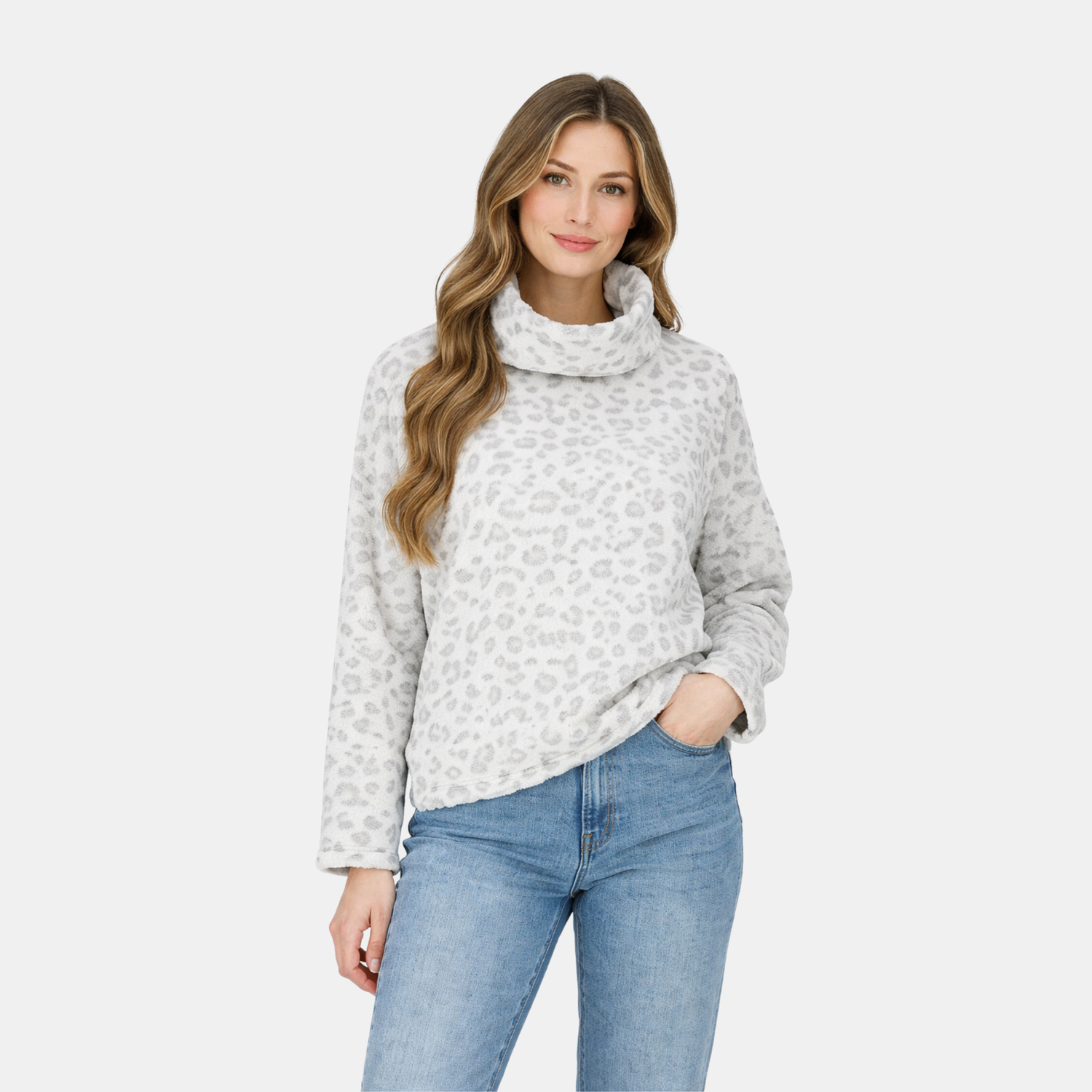 Made from a soft, fluffy fleece fabric, this cosy jumper delivers exceptional comfort and warmth, making it the perfect choice for colder days. The luxury oversized collar adds both extra warmth and a stylish finish, while the embossed leopard design brings a subtle yet fashionable touch.